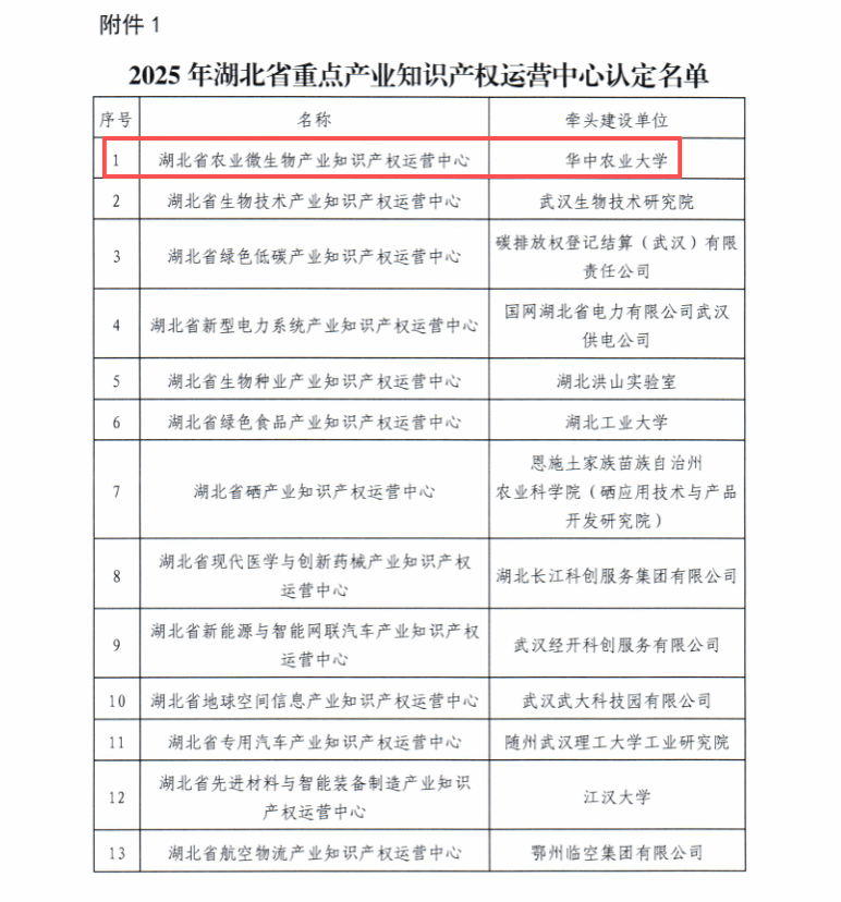 (通讯员 王秋妹)近日,省知识产权局发布《关于认定2025年湖北省重点产业知识产权运营中心的通知》,由我校牵头,联合湖北洪山实验室、中部知光技术转移有限公司等5家单位共建的“湖北省农业微生物产业知识产权运营中心”正式获批成立,中心建设项目实施期为两年。