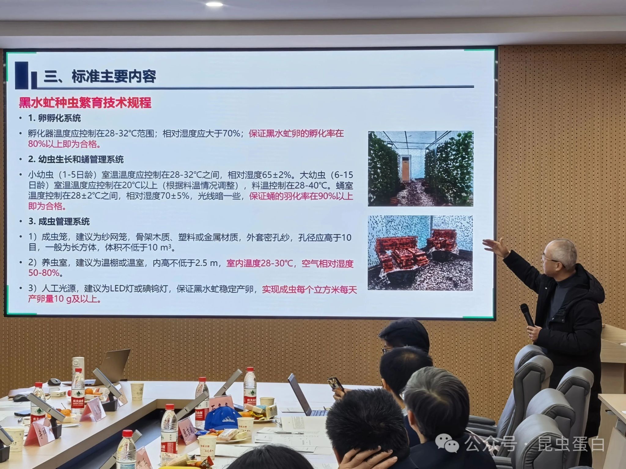 在为期两天的审定过程中,专家组对三项标准进行了严格、细致的审议。中国农业科学院饲料研究所石冬冬博士汇报了《饲料原料黑水虻虫粉》标准的编制情况。微生物与食用昆虫团队张吉斌教授分别就《黑水虻种虫繁育技术规程》和《饲料用黑水虻幼虫生产技术规程》两项标准进行汇报,系统介绍了在黑水虻种虫选育、规模化养殖、工艺优化等方面的研究成果与实践经验。